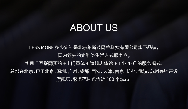 LESS MORE 多少定制是能夠提供男士全品類定制產(chǎn)品的生活方式品牌,對于中國商務(wù)男士來說,定制是對西裝最認(rèn)真的態(tài)度。